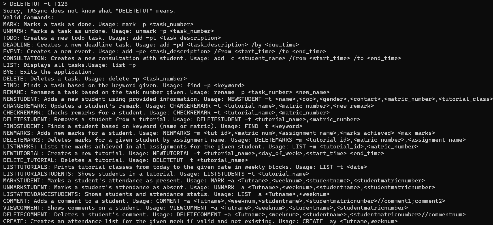 The DELETETUT command comes up as unrecognized and then prints out a list of commands similar to when using the HELP command. This is dissimilar to when using an invalid command as normally a list of commands would not appear.