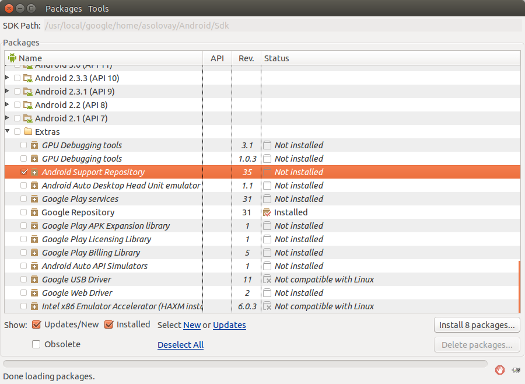 export ANDROID_NDK_HOME=~/Devel/android-ndk-r9c/- Install the android support library and repository. Type: