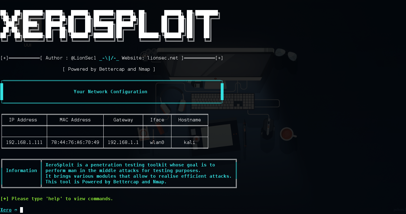 Xerosploit is a penetration testing toolkit whose goal is to perform man in the middle attacks for testing purposes. It brings various modules that allow to realise efficient attacks, and also allows to carry out denial of service attacks and port scanning. Powered by bettercap and nmap.