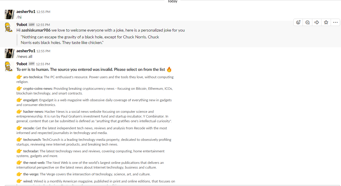 | /news <news_agency> | Fetches top headlines from the agency passed | /news recode |