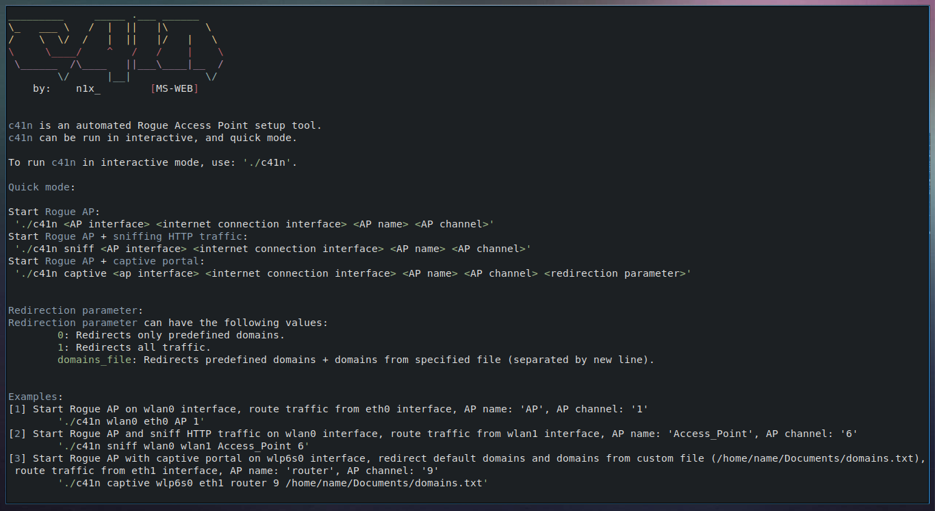 c41n provides automated setup of several types of Rogue Access Points, and Evil Twin attacks. c41n sets up an access point with user defined characteristics (interface, name and channel for the access point), sets up DHCP server for the access point, and provides user with abilities of HTTP traffic sniffing, or Captive Portal setup with credential sniffing.