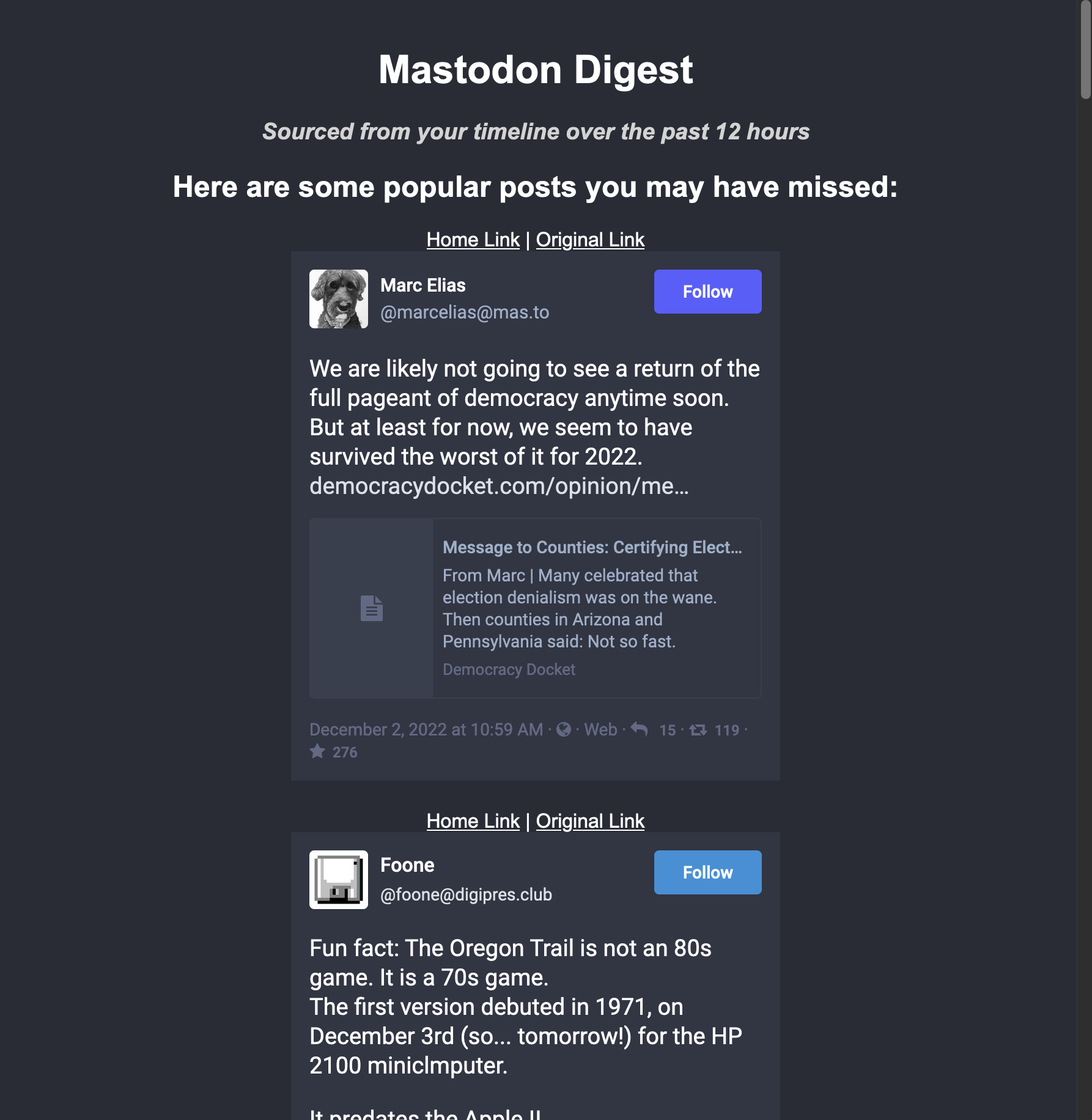make dev FLAGS="--theme my-theme"This code can also be used to run a simple digest bot. With a linked account, it can be used to share the digest which it would prepare as an HTML page by boosting all the toots it would include in the HTML page. The account should be identified as being a bot in its profile, and on an instance where such bot accounts are permitted.