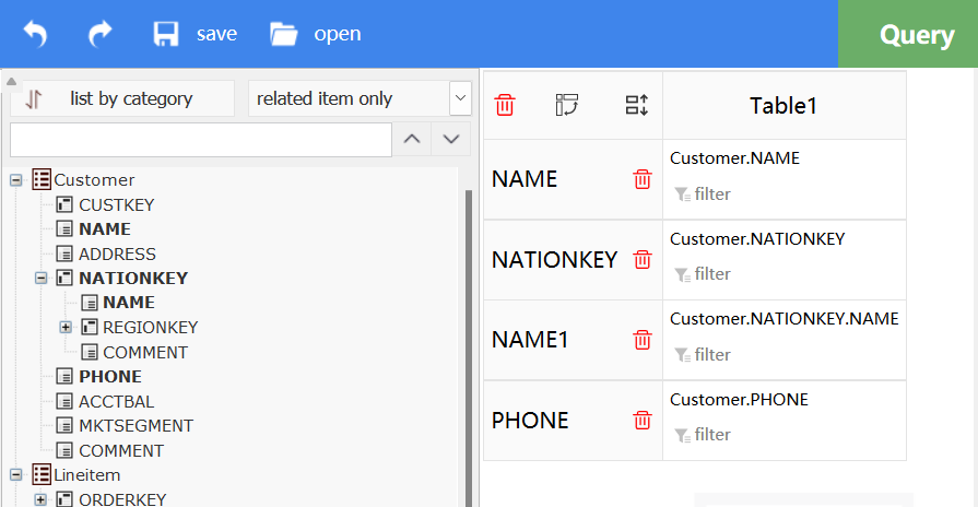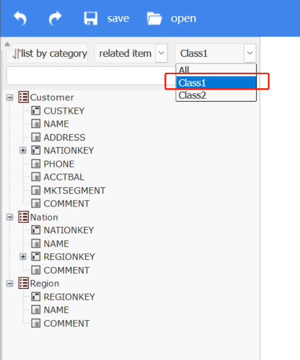 Based on metadata file TPCH.glmd, define two metadata scopes Class1 and Class2 to switch between them on the interface. When Class1 is selected, only Customer, Nation and Region tables are displayed: