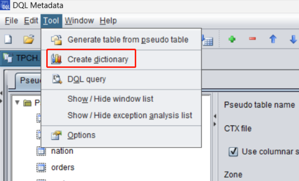 Open metadata file (TPCH.glmd) and click “Tool -> Create dictionary” on the menu bar to create a dictionary file based on TPCH.glmd: