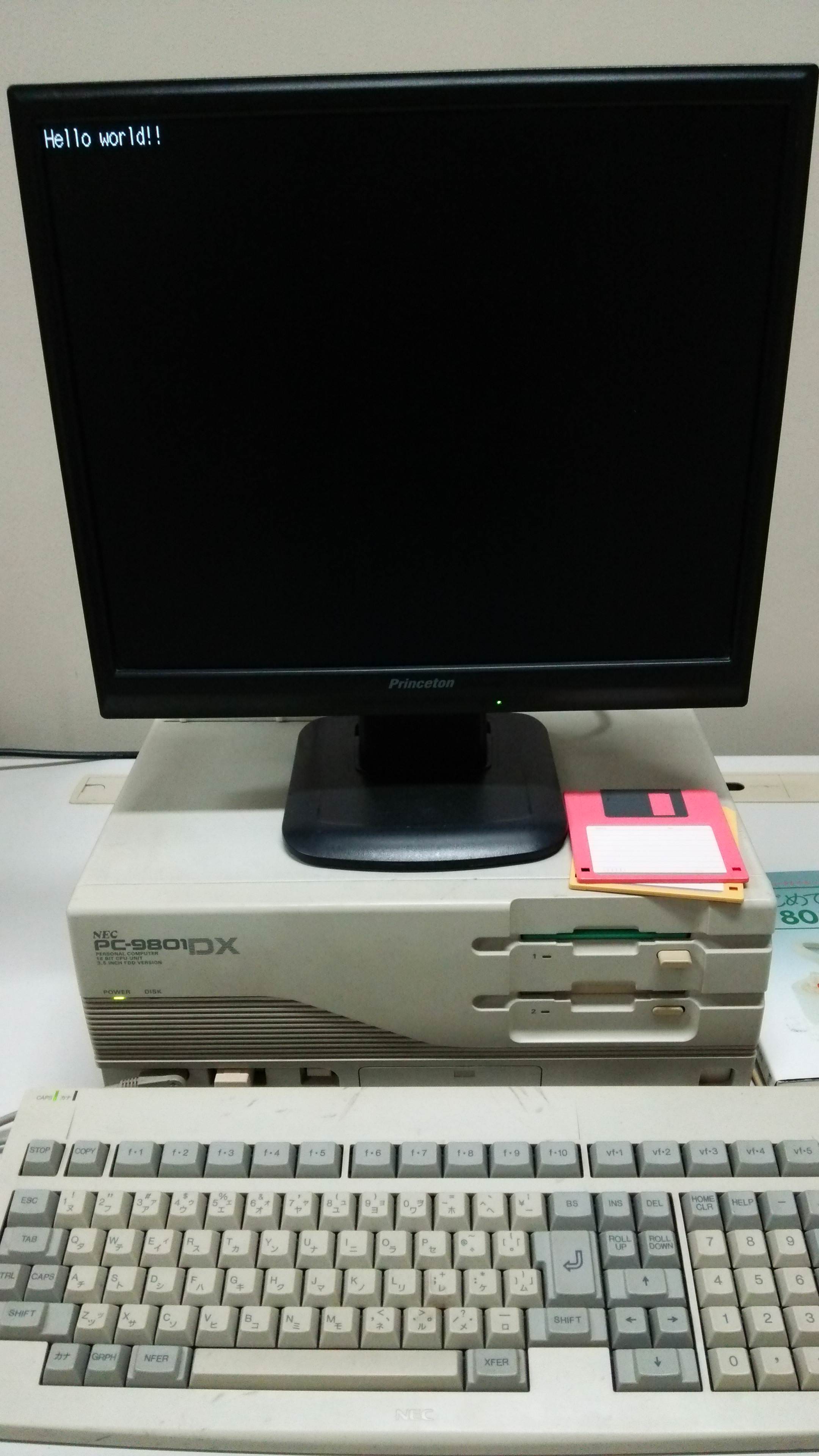 あとはそのFDをPC98に差し込んで起動するとHelloWorld出来ます。