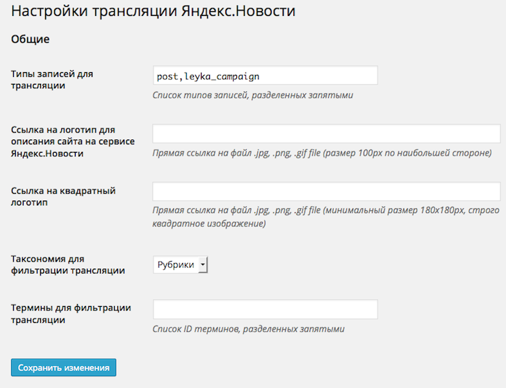 После установки настройки плагина доступны через меню Настройки -> Яндекс.Новости. Пример страницы настроек