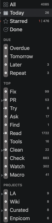 - I love GTD methodology. This app is phenomenal with helping me organize my tasks. Here is how my sidebar looks: