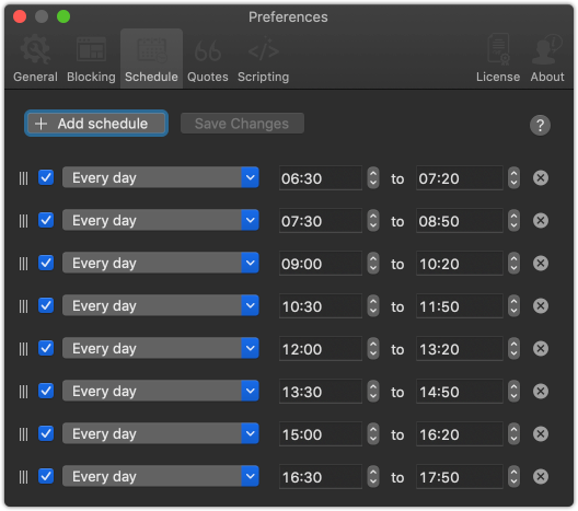 - I use Focus app as a recurring pomodoro timer which lets me work in sessions of 80 minutes with 10 min breaks by blocking distracting websites and apps.