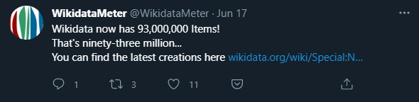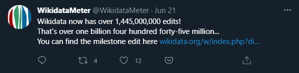 I'm the code, and deployment of Twitter bot WikidataMeter. I tweet a few fun things about Wikidata as it grows.