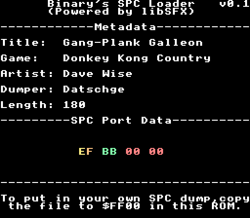 Simple SNES Rom that transfers the SPC file stored at $FF00 into the SNES APU RAM and plays it. Shows relevant metadata and SPC communication ports while playing. Designed so you do not need to reassemble or modify the SPC file to change the tune. Just copy the contents of the SPC file to $FF00 of the ROM and you're good.