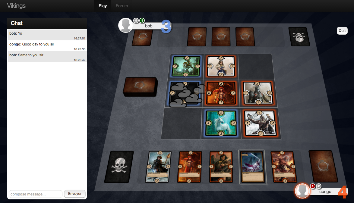 Vikings Multiplayers card game heavily inspired by Triple Triad, AngularJS, Socket.IO, and Node.js. Installation npm i Usage Start the game server: npm start And open http://localhost:8080/