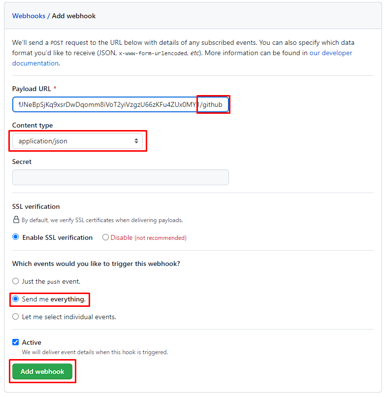 /githubao final. Selecione "Envie-me tudo", defina o tipo comoapplication/jsone, em seguida, adicione Webhook