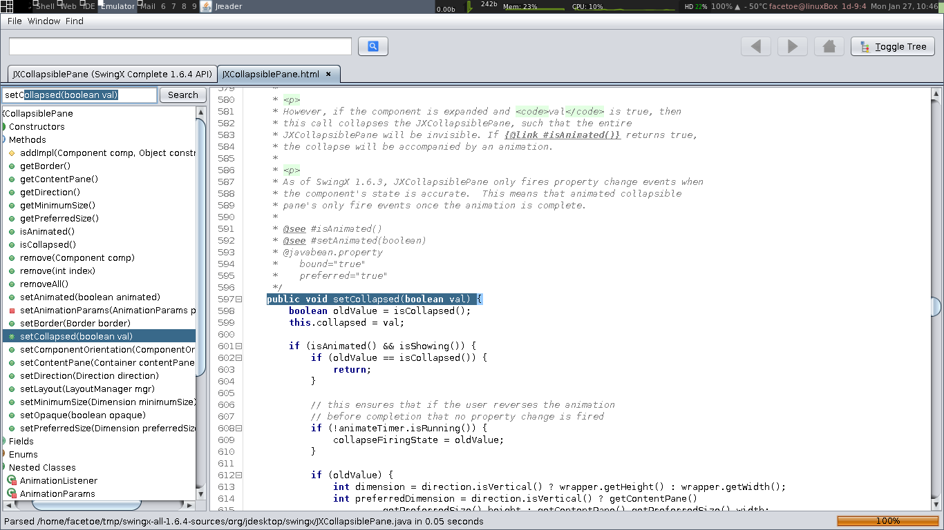 Here we see the documentation for CollapsiblePane, used to expand the tree view in JReader.
