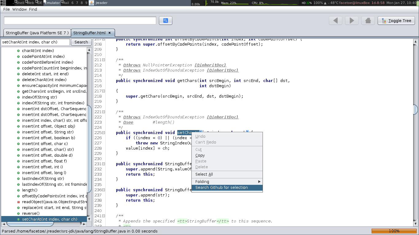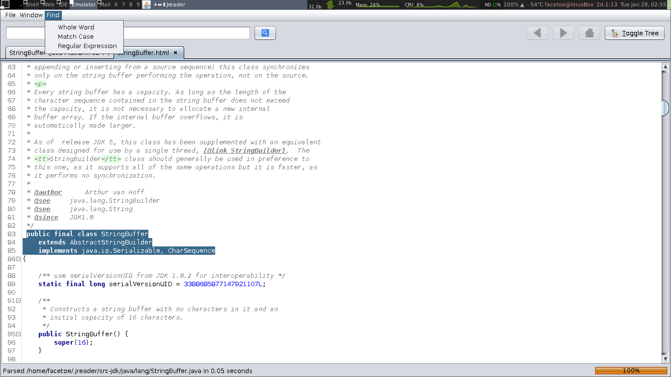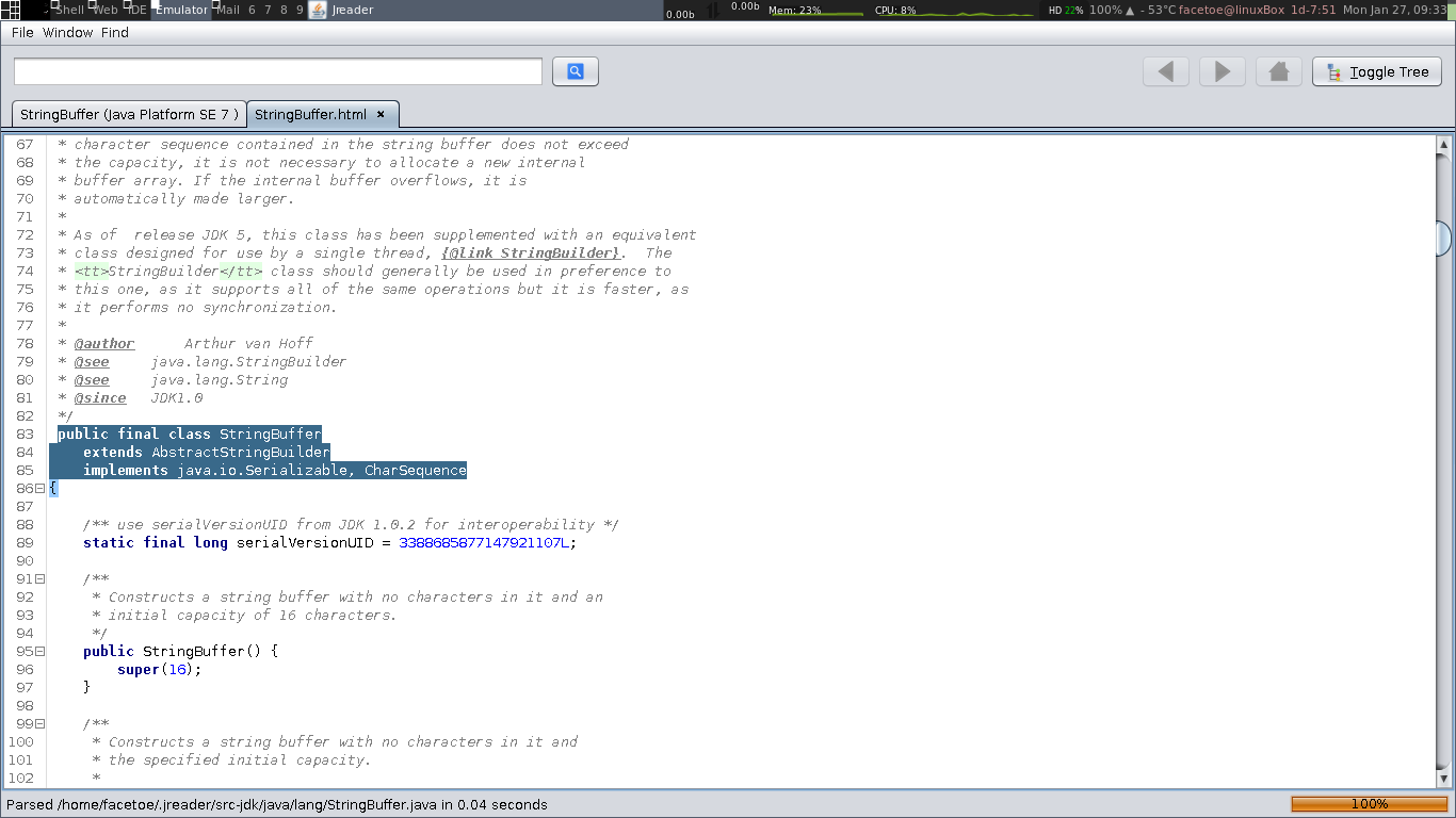 Here we have the documentation for StringBuffer. Note that JReader auto-completed the class name. All text boxes in JReader support auto-completion.