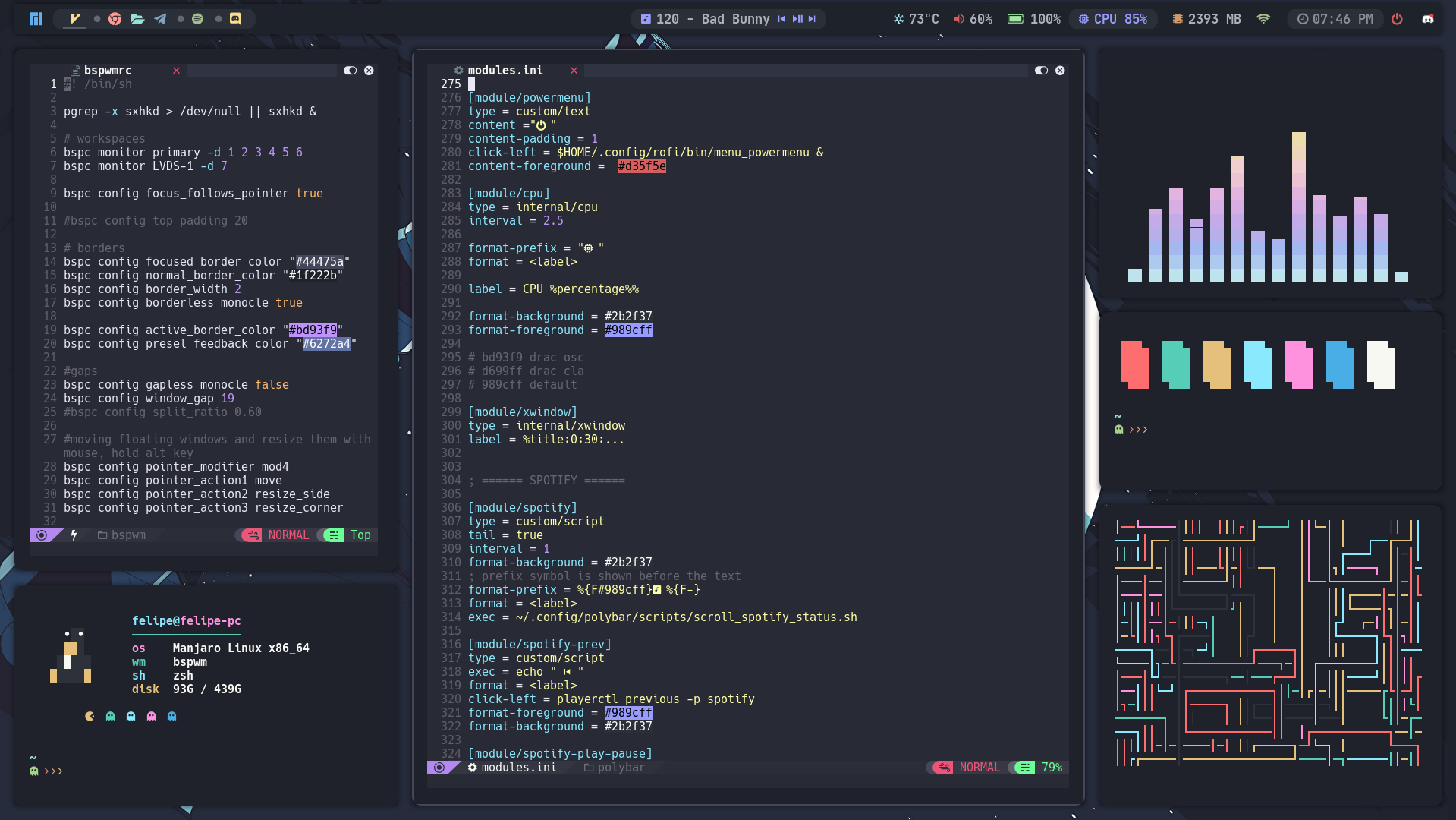 - In my bspwm I used a python script so every time I start bspwm the wallpaper changes. Inside the script I call a folder where I keep all the wallpapers. If you want to use the script you should set your wallpapers folder path here, if you want to disable the script you should comment line 51 of bspwmrc and uncomment line 48 to set a wallpaper path.