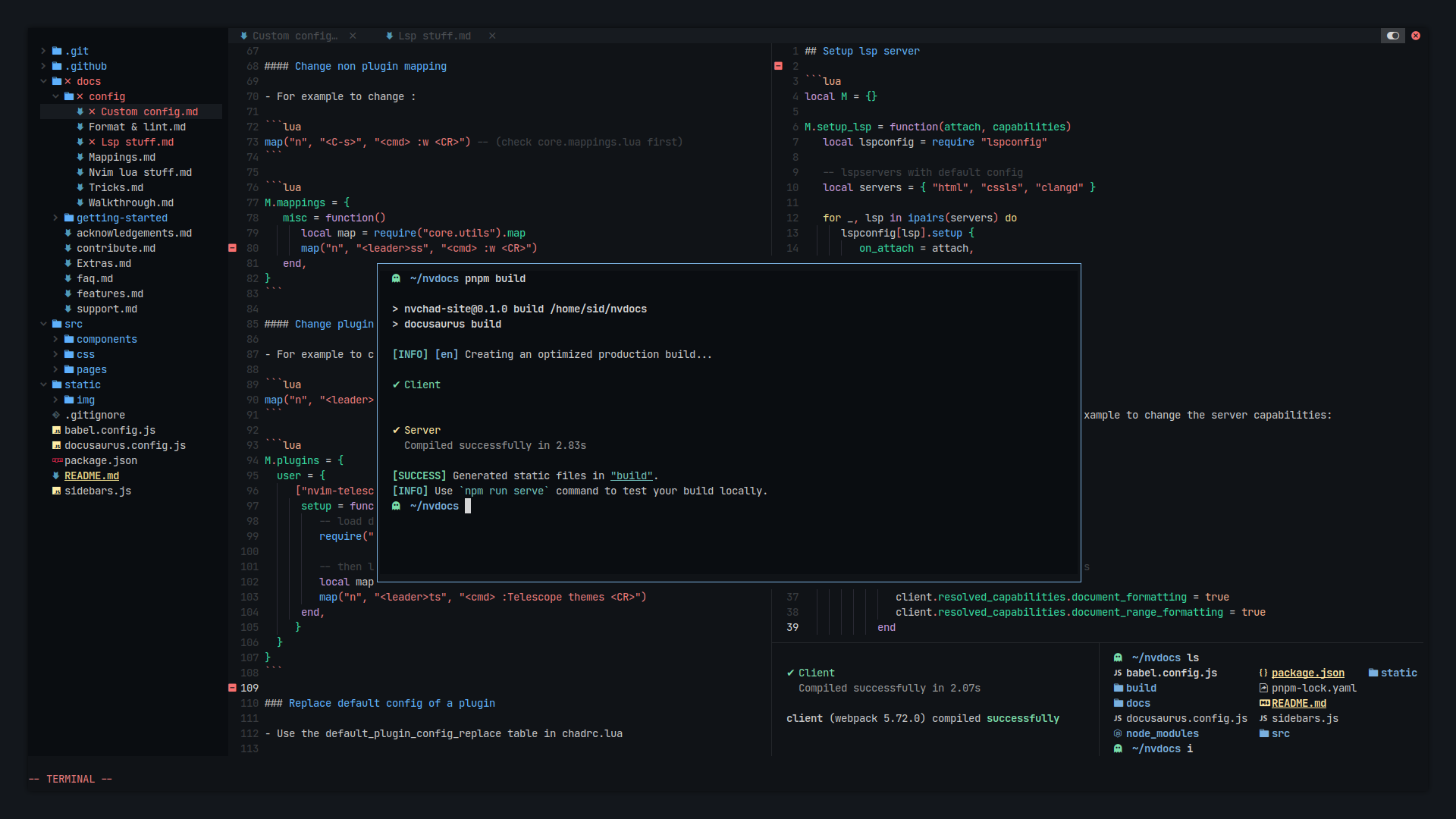 • NvChad is a neovim config written in lua aiming to provide a base configuration with very beautiful UI and blazing fast startuptime (around 0.02 secs ~ 0.07 secs). We tweak UI plugins such as telescope, nvim-tree etc well to provide an aesthetic UI experience.