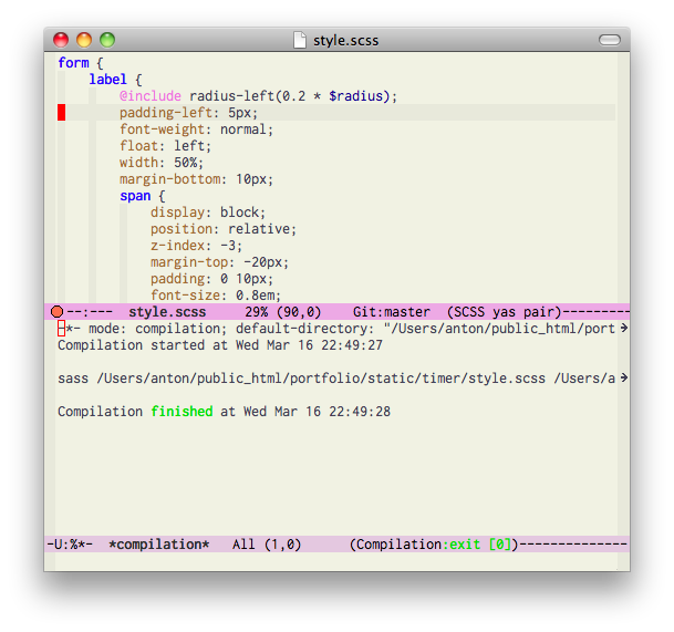 • Compilation of current file on save. (Disable by changing scss-compile-at-save to nil)