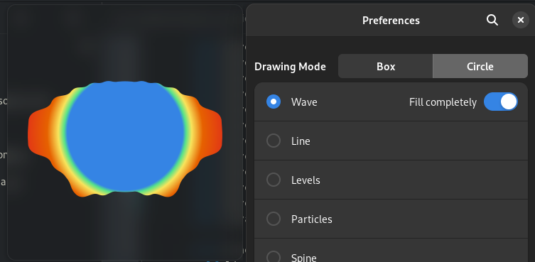 The setting would be a good compromise. Probably called "wave-circle-fill" in the schema, and in the UI it would be a switch with description "Fill completely", it can be added as the suffix of Wave row and only shown when Circle is on. |