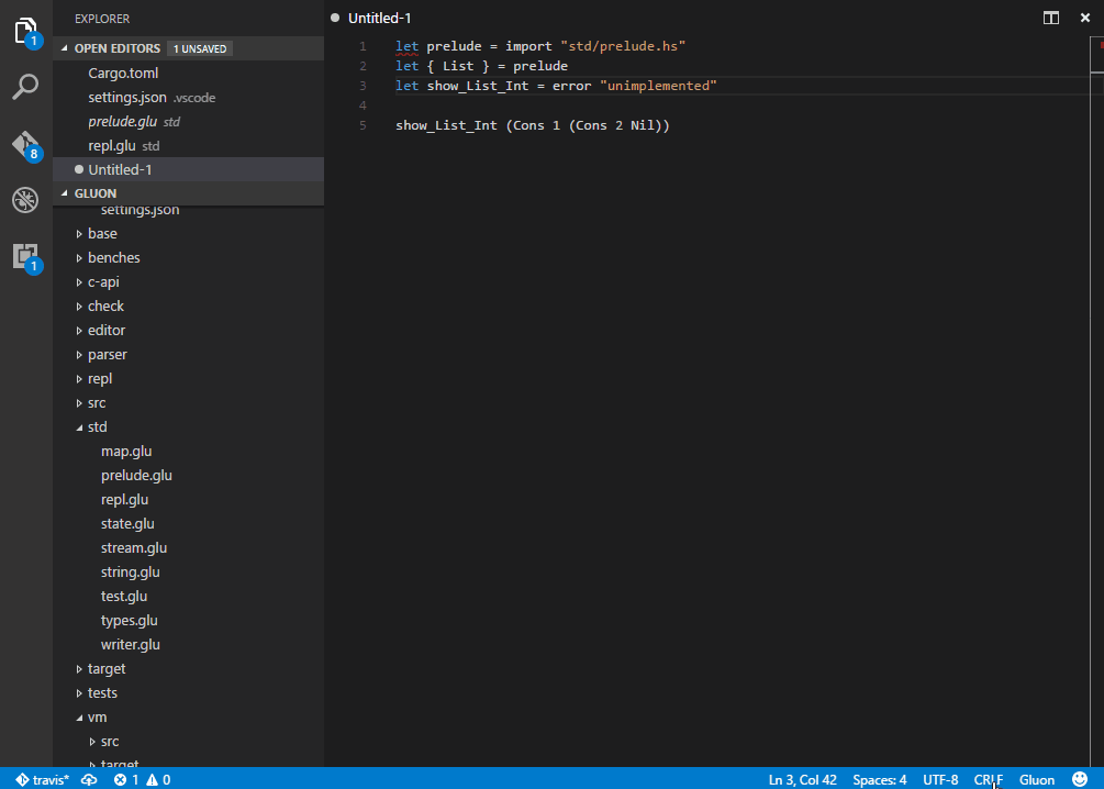 gluon = "0.18.2"Currently, the easiest way to interact with the gluon virtual machine is through Rust but a rudimentary C api exists which will be extended in the future to bring it closer to the Rust API.