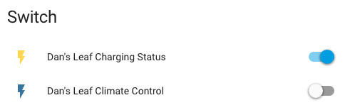 Currently introduces two switches (climate control and charging, charging can only be turned on as per the weird API limitation), 3 sensors (battery charge and range with and without AC on) and a binary sensor for if the car is currently plugged in.