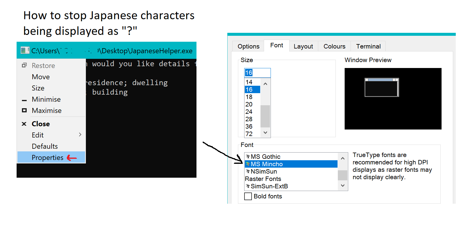 - Lastly, make sure you are on the "Font" tab and select the "MS Mincho" font, there are a few other fonts that work too such as MS Gothic