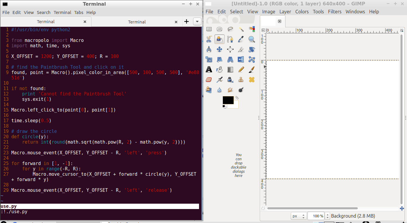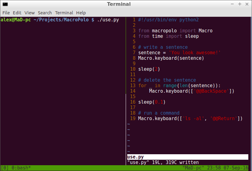 Macro.keyboard(['ls -al', '@@Return'])Below you can see the result (on the left) of a python script using macropolo (on the right)