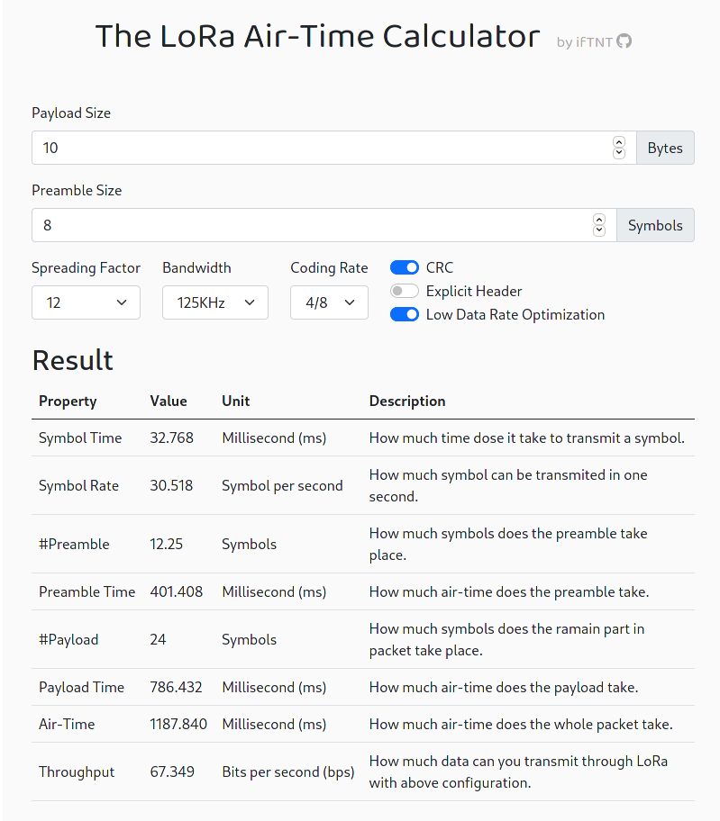 I was wondering whether the air-time had been given in the datasheet is correct. So I performed the following experiment to validate the correctness of this calculator.