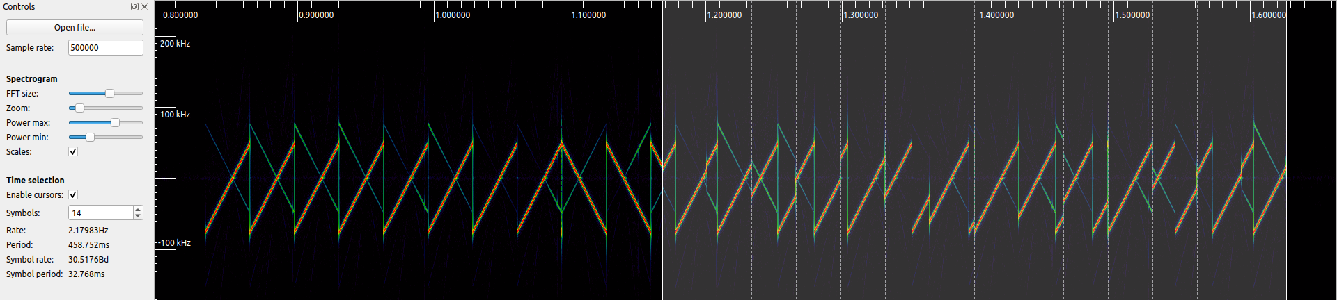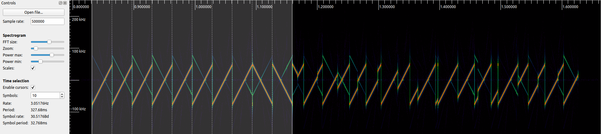 I use USRP-B210 software-defined-radio and gqrx to capture the raw I/Q data of LoRa signal transmitted by SX1276 at 920MHz unlicensed band. Then analysis it with inspectrum. The overall result provide an excellent prove to the correctness of calculator which is a good news for me. The detailed result is shown as below.