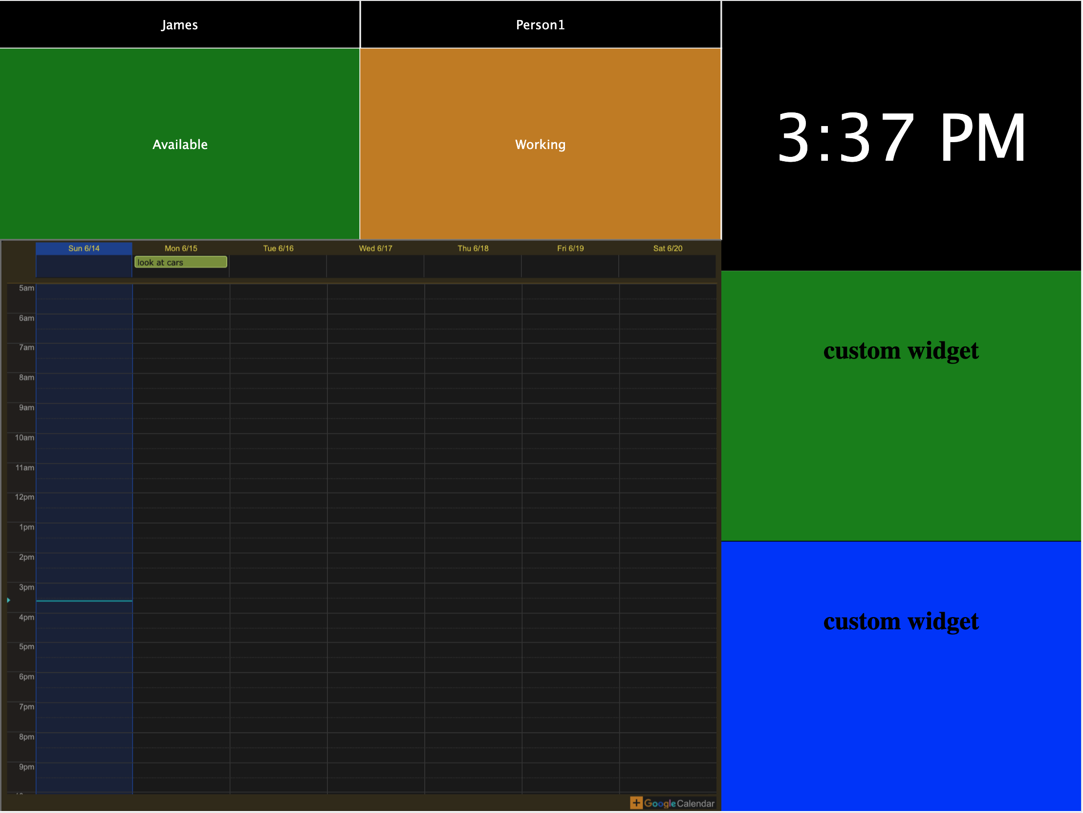 Statusboard lets you create a customizable signage board, where you can mark your availability alongside roommates or friends. It is ideally suited for use on a small touch-screen tablet which you can set near your workspace, so that it can both let you see whether the other people you're tracking are available or busy, and display things like a clock, your calendar, and the weather which you want to be able to see at a glance.