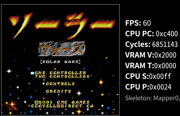 NES emulator ファミコンエミュレーター This is a NES emulator created using client-side HTML JavaScript. これはクライアントサイド HTML JavaScript を使用して作成されたファミコン エミュレータです。 How to use It's basically the same as any other NES emulator. 基本的には他の ファミコン エミュレーターと同じです。 ScreenShot Community Frank frankdevcommunity