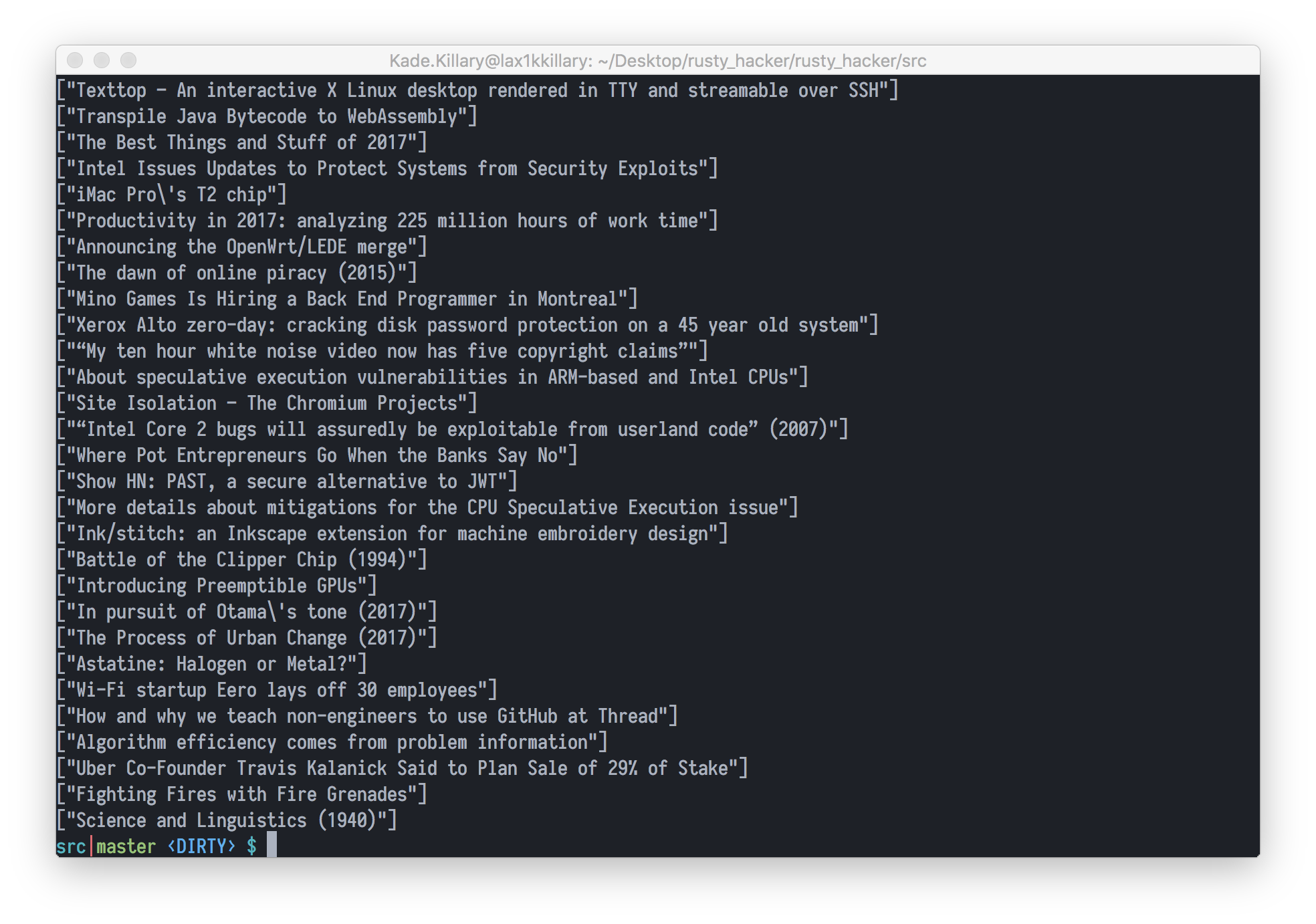 }Perhaps the most foreign part of this syntax is the :: annotations. The symbol merely designates a path. So, Html::parse_document allows us to know that parse_document() is a method on the Html struct, which is from the crate scraper. Other than that, we read our get request's response into a document, specified our selector, and then looped over every instance collecting the headline in a vector and printed to stdout. The example output is below.