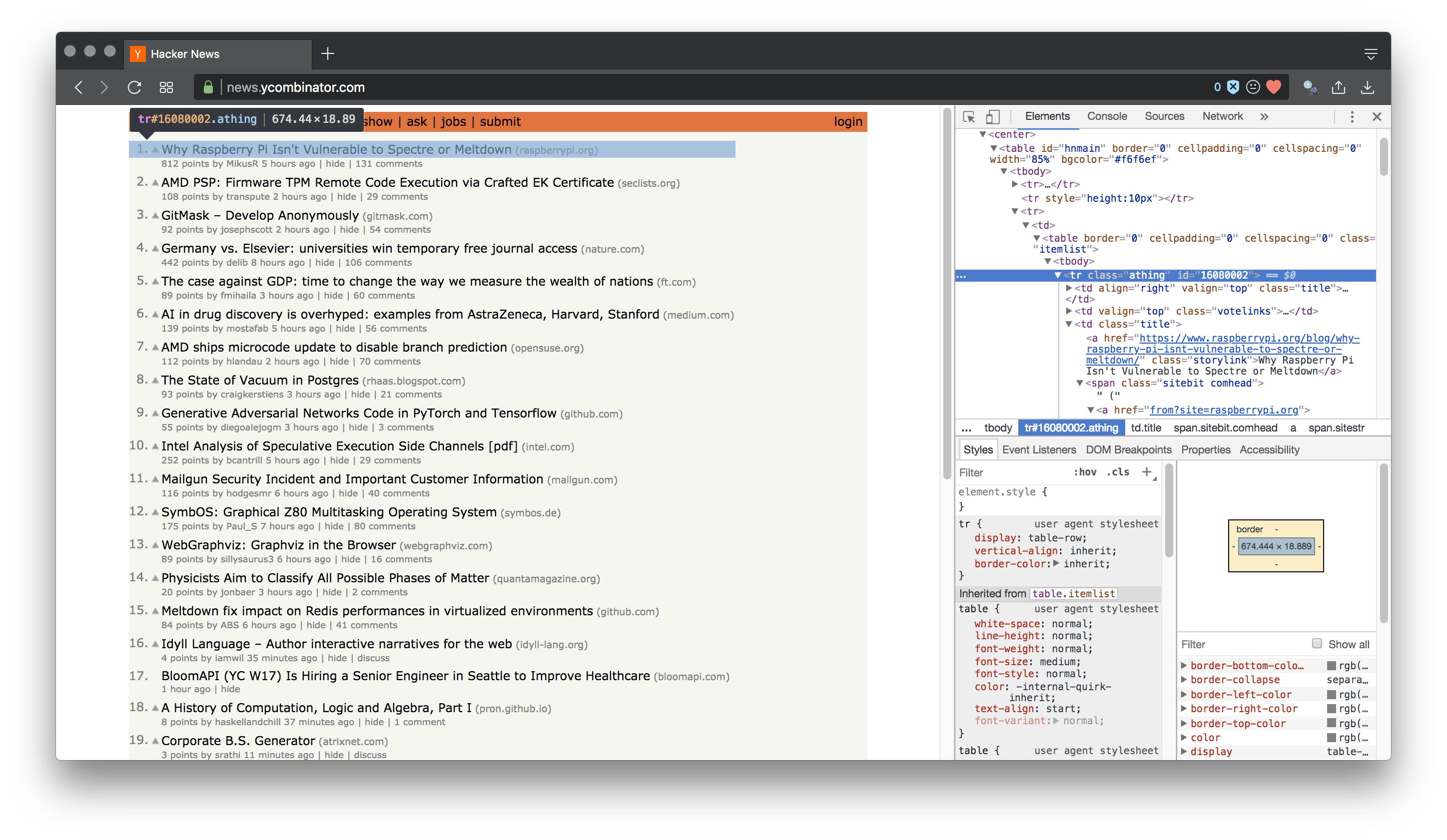 From the image it's pretty clear it's a class called "athing". We need the top level attribute in order to iterate through every occurrence and select our desired fields.