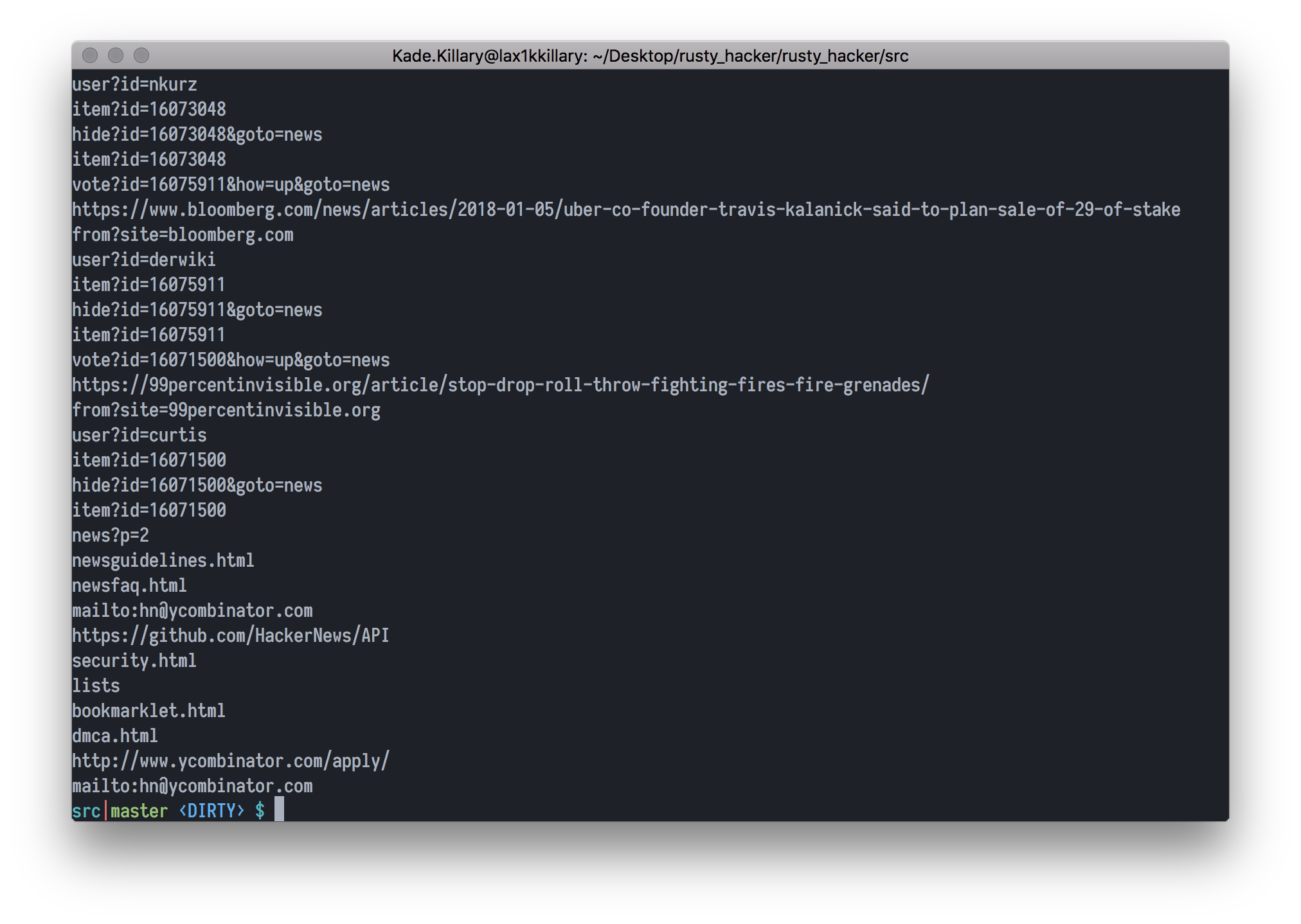 }The main things to note are unwrap() and the |x| notation. The first is Rust's way of telling the compiler we don't care about error handling right now. unwrap() will give us the value out of an Option<T> for Some(v), however if the value is None the function will panic - not ideal for production settings. This is a common pattern when developing. The second notation is Rust's lambda syntax. Other than that, it's fairly straightforward. We send a get request to the Hacker News home page, then read in the HTML response to Document. Next we find all links and print them. If you run this you'll see the following: