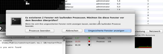 If you use some share (smb/afp) to sync/update files, you have to manually disconnect from the machine, otherwise this message will block the reboot.