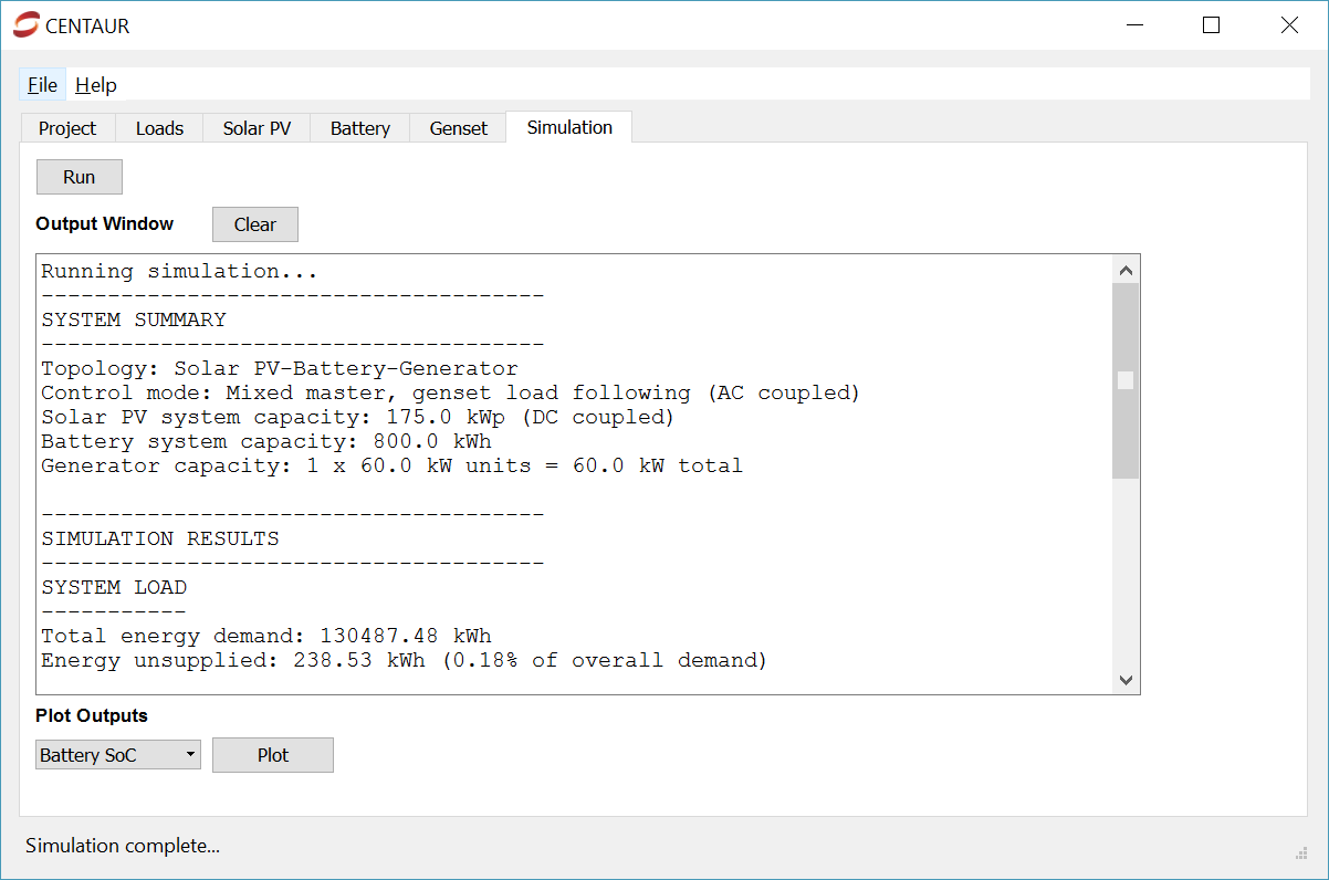CENTAUR is a python-based hybrid power system simulation program with a functional and lighweight GUI. It can be used for the design and simulation of hybrid solar PV-battery-diesel microgrids and is intended for both research and practical/commercial purposes. In particular, CENTAUR was originally developed as an open source platform to trial and experiment with novel control operating modes / strategies in a solar PV-battery-genset system. Note that unlike HOMER or Hybrid2, CENTAUR does not have optimisation functionality.
