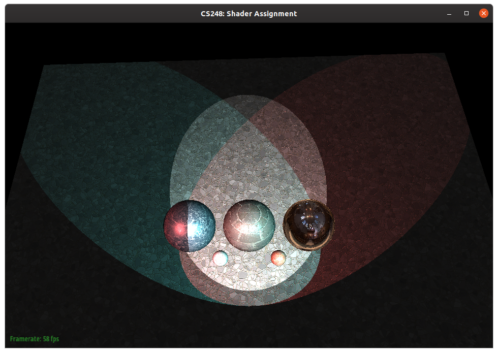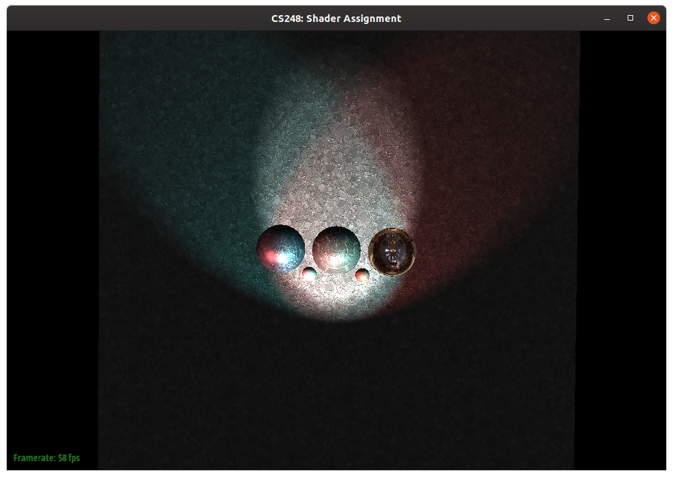 The first step in this part of the assignment is to extend your fragment shader for rendering spotlights. You will need to modify media/shader_shadow.frag for this task. Note that if you have completed Parts 1-3 of the assignment, you can drop your solutions from shader.vert and shader.frag into this file so that you can render media/spheres/spheres_shadow.json with correct texture mapping, normal mapping, and environment lighting.