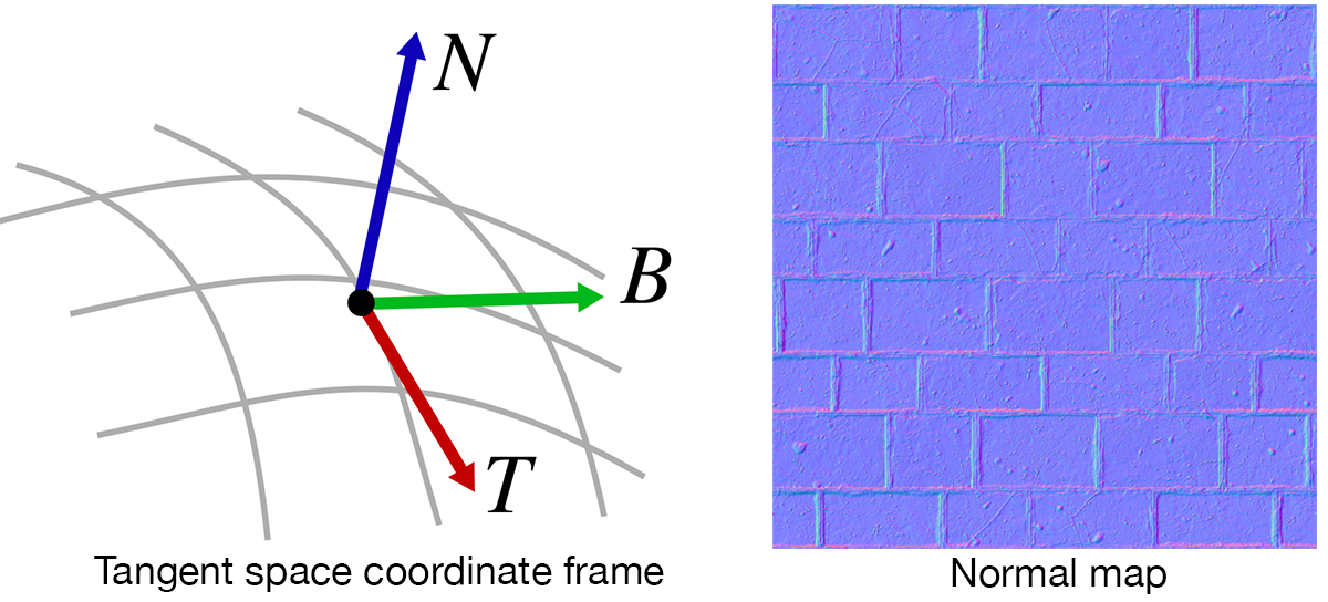 Each RGB sample in the "normal map" encodes a 3D vector that is a perturbation of the geometry's actual normal at the corresponding surface point. However, instead of encoding this offset in single coordinate space (e.g, object space or world space), the vectors in the normal map are represented in the surface's tangent space. Tangent space is a coordinate frame that is relative to the surface's orientation at each point. It is defined by the surface's normal, aligned with the Z-axis [0 0 1] in tangent space, and a tangent vector to the surface, corresponding to X-axis [1 0 0]. The tangent space coordinate frame at a point on the surface is illustrated at left in the figure above.