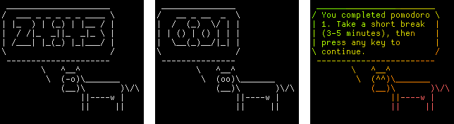 - Traps SIGINT to make Ctrl-C abandon pomodoros.
