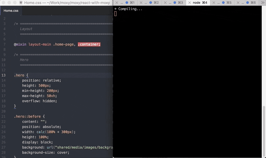 When making a production build, you must compile both the client and server. When developing, we want to rebuild the client & server and bring in the new compiled code without restarting/reloading the application. This is complex, especially setting up the development server.