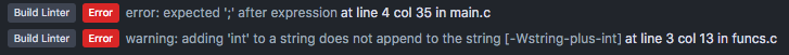 If your build outputs multiple errors, all will be matched. Press Cmd Alt G (OS X) or Ctrl Alt G (Linux/Windows) to cycle through the errors (in the order they appear, first on stderr then on stdout), or you can use the Atom Linter integration discussed in the next section.