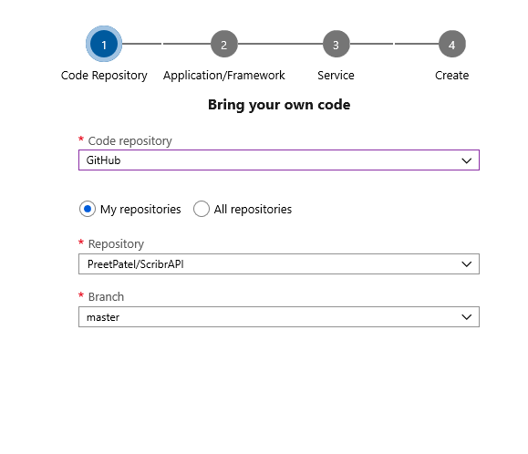 Now you want to select the Code Repository as GitHub and go through the process of selecting your repo and branch (commonly the master branch unless you've made seperate branches)
