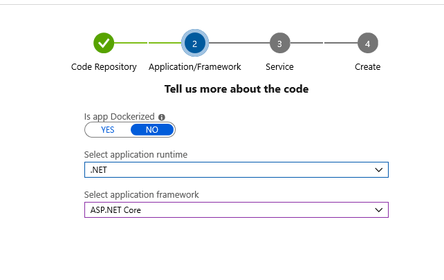 Cool! Once you've done that, press next and you will get to the page that asks you to configure your framework. Since the API was coded in a .NET environment, we will choose the runtime as .NET and the application framework as ASP.NET Core