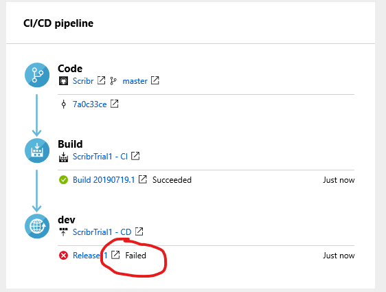 Now comes the waiting game. Complete the setup and wait for an initial release of the build to complete. It will fail in the final stage because in step 3, we specified our path to application code as "build/" but that folder does not yet exist. We need to ask npm to build the project first. Click on the Failed link and follow the images below to get to the stage where you modify a pipeline.