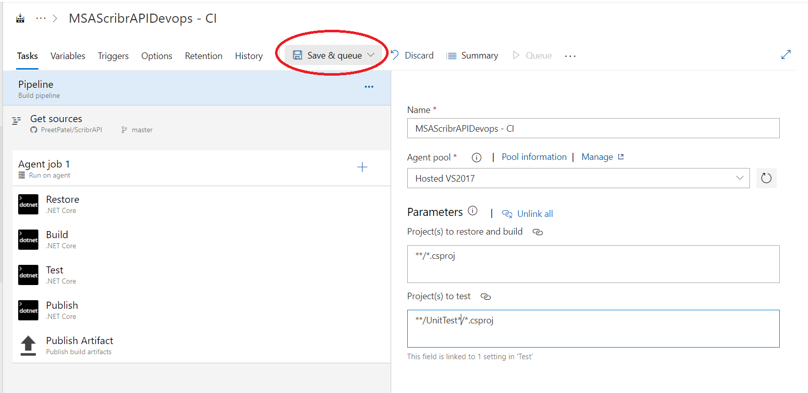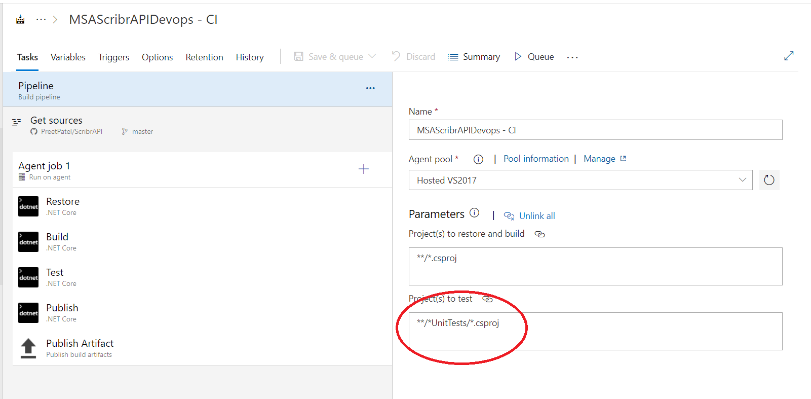 We need this to match the Unit Test project, so change it to **/UnitTest*/*.csproj Once you've done that, click Save & Queue. There will be another popup asking you to confirm the save.