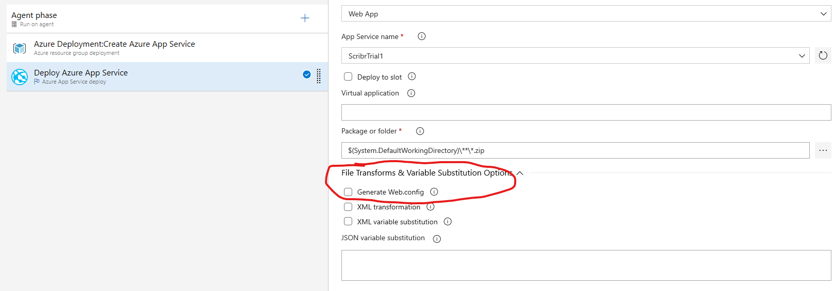 If you just tried to run the pipeline before this, you would have noticed that you get an Error 404 on the website after a successful deployment. This is because Azure adds a pre-templated web.config file to our web app that messes up the way react handles its rendering. To get around this, we will need to stop azure from adding the web.config file. Follow the images below to find the checkbox that generates the web.config file and disable it.