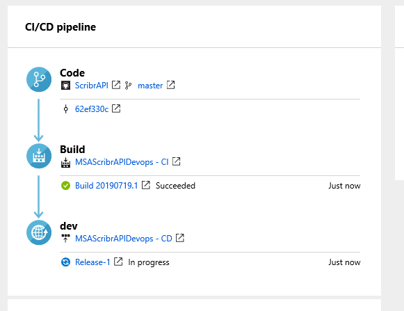 And that's pretty much it. If you've configured everything properly, you will see the follwing stages shown below where your code is compiled in the "Build" stage and then sent to dev to be released onto your web app. You can track the status of each of the tasks by clicking on the "in progress" links.