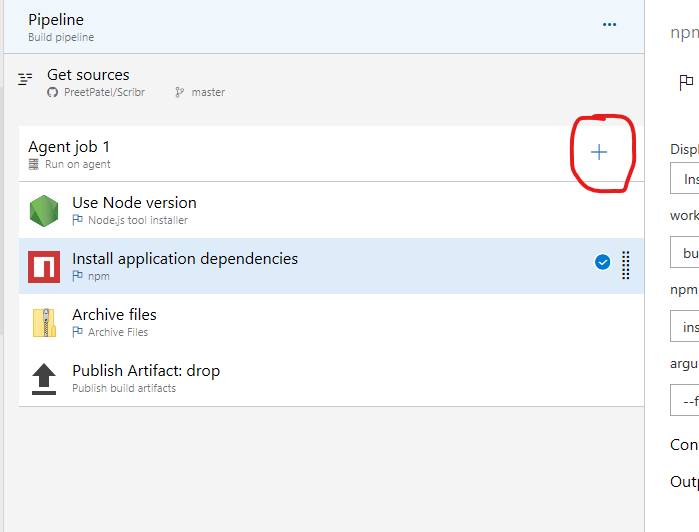 Modify the npm command as shown below. What we are doing here is basically asking the pipeline to run "npm run-script build" so it can generate static files for us to deploy. After doing that, dont press "Save and Queue" but press just "Save". We still have a little bit to do before we can run this pipeline. You can try queuing it if you're feeling curious and then come back to Step 7.
