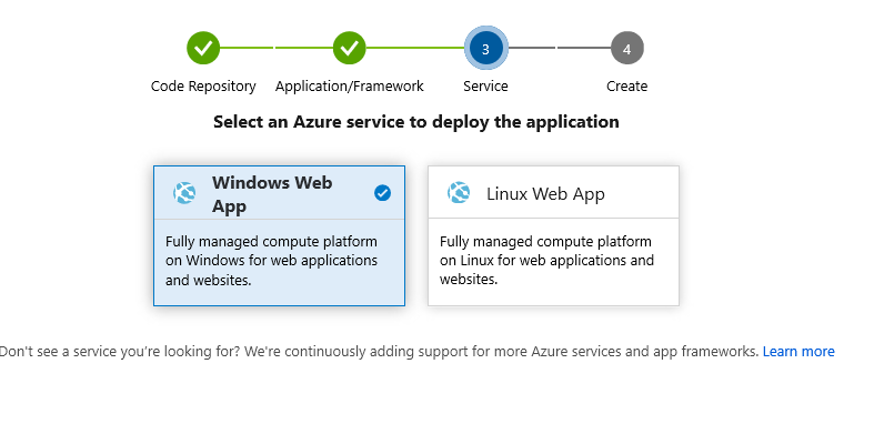 Press next, and choose the Azure service as Windows Web App. This is becaue our project is an ASP.NET app and it does not make sense to run it on Linux as Windows is supported by default.