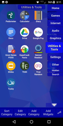 LaunchTime is an alternative home/homescreen/launcher for Android devices. Its main feature is a side menu used to organize your apps into common-sense and configurable categories. It also features support for widgets, text search for apps, a QuickBar, links/shortcuts, icon packs, badge/unread counts, recent apps list, app hiding, color selection, themes, and portrait and landscape support.
