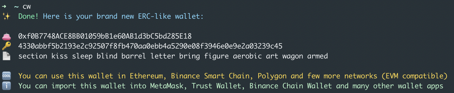 $ npm i -g @yerofey/cryptowallet-cli# generate random ERC-like wallet (ETH, BNB, POLYGON, ...)